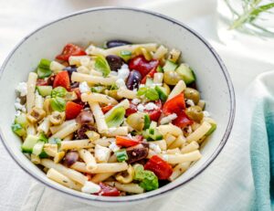 Ensalada de pasta integral con atún, verduras y aliño ligero de limón y yogur